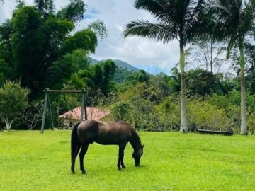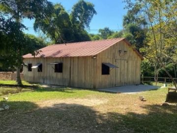 Conforto: Casa principal com 2 quartos e ar-condicionado, suíte anexa e galpão rústico com baias para cavalos.